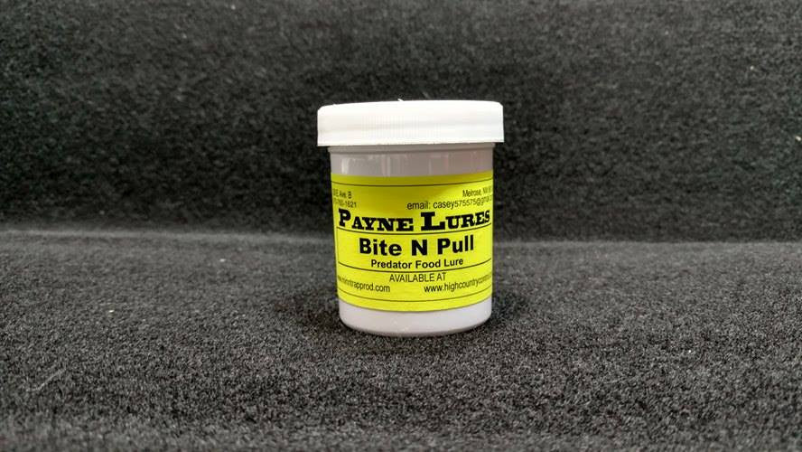 BIT-N-PULL: A very aromatic food lure. Makes Coyotes want to bite and pull. Also works for catching Bobcats. Good year round and in any climate.
