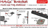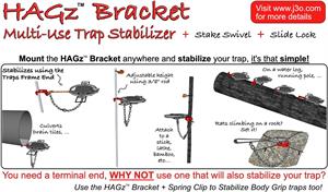 HAGz Brackets are multi-use devices originally designed for the water trapper to stabilize virtually any foothold trap anywhere you mount it. Plus, they work as stake swivels or slide locks. HAGz Brackets unleash new setting opportunities, improve efficiency and reduce overall cost.