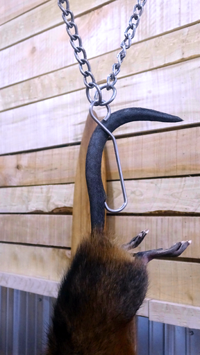Used to hang Muskrats while skinning. Pierce the point of the hook into the bottom of the tail 1"-2" inches from the fur line. The point of the hook will bite into the tail bone, holding the Muskrat in place and keeping it from falling while you skin.