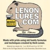 Muskrats really go for this powerful and unique aroma of intensely sweet aromatics, essential oils, muskrat musk, and a remarkable secret ingredient used by no other lure maker! Once you see the results of this totally waterproof, thick paste lure you will never trap without it! We have received thousands of testimonials on this fantastic lure! Lenon's Muskrat Super All Call It's an amazing Raccoon lure too! Try it, you'll love it!