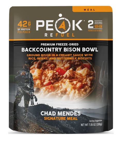 HIGH PROTEIN | 100% REAL BISON MEAT | PREMIUM INGREDIENTS - Ground Bison in a creamy sauce with rice, beans, and buttermilk biscuits.