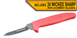 This replaceable blade hunting knife has a handle that is constructed of a soft-touch material for wet days afield or greasy hands in the skinning shed. The knife measures 8 inches overall, and comes with 24 wicked-sharp replacement blades.